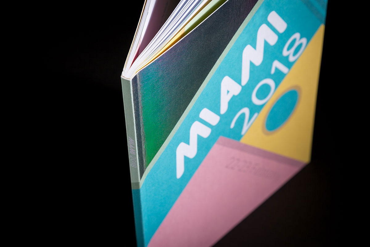 This bespoke event guide was printed with a special holographic foil finish for a client who operates within the financial services sector. The guide was designed to support a financial conference taking place in Miami. Referencing the art deco influences of Miami Beach, the booklet was printed on an uncoated stock – ‘Vision Superior’ using pastel pink, mint, blue and yellow. The guide was PUR bound for a neat finish and the holographic foil added to the cover created interest and added quality.
